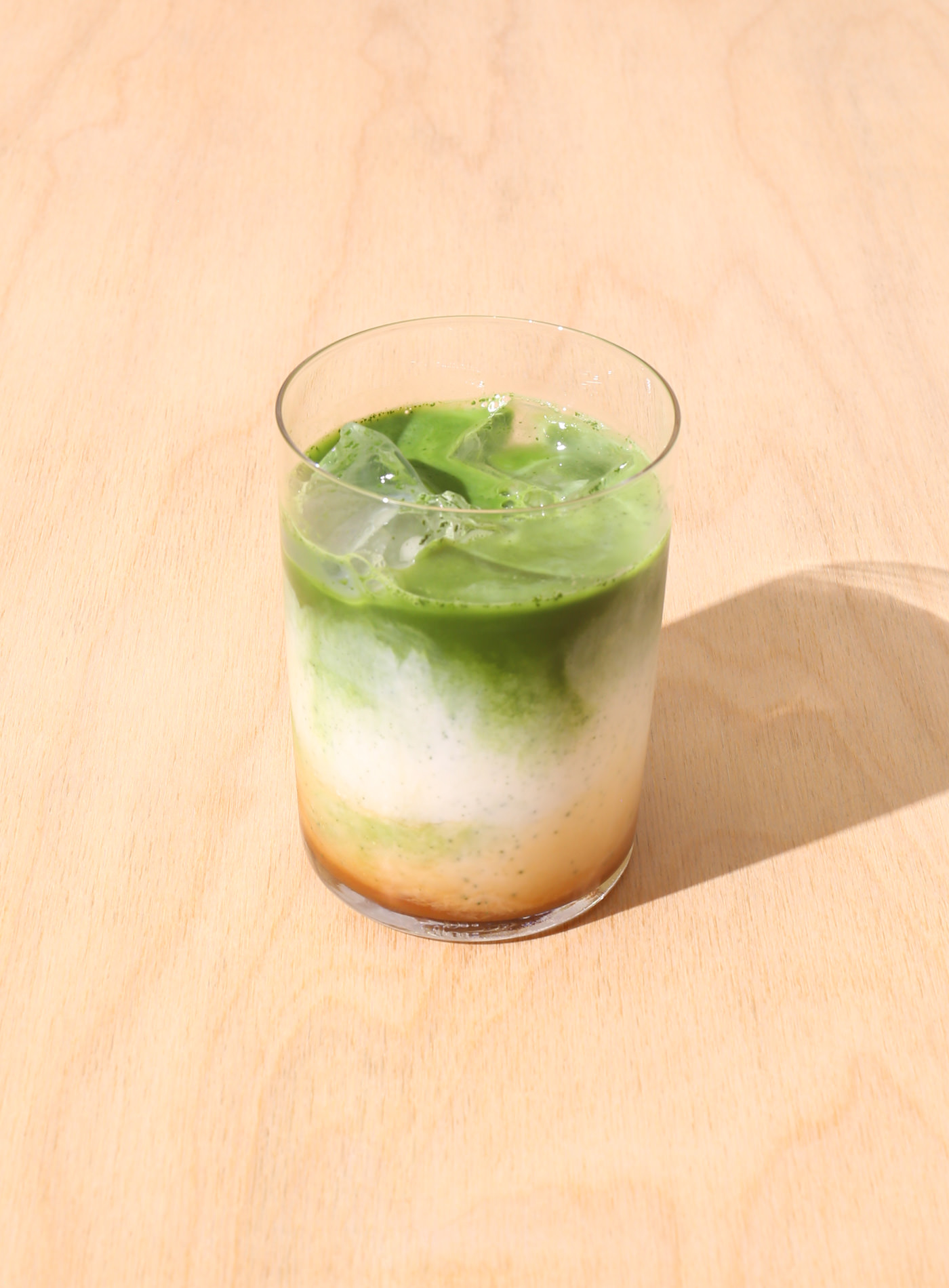 抹茶を冷水で点てておきます。氷を入れたグラスに、チャイシロップを注いだ後、混ざらないように、氷を伝わせて牛乳をゆっくり注いでください。最後に冷たい抹茶を静かに注いで出来上がり。